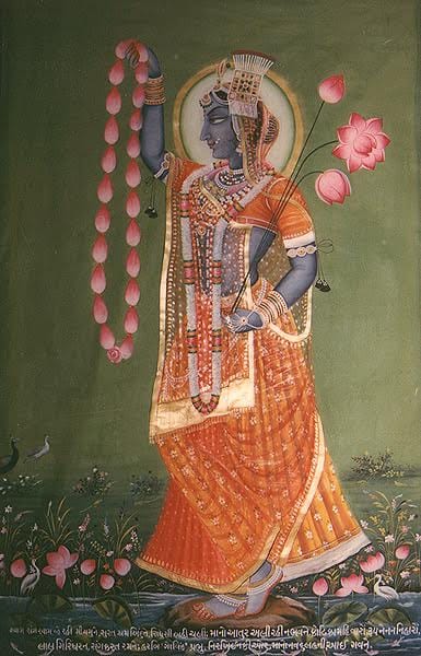 O Shyamsundarī! O numinous dark goddess who accepts the form of a river (Yamuna-devī) black like the color of Shyam! I wish to be baptize in your waters following the footsteps of the young unmarried girls of Braja whose vrata to attain Beloved Shyam would not have been complete, or perhaps even possible, without your liquid grace. Abandoning their earthly-elemental clothes, they adorned themselves with the obsidian-colored liquid-dress of your waters and looked exquisitely beautiful. Pleased by their joyous endurance, and their songs, and their quiet but passionate aspiration which they carried in their hearts whilst bathing in your waters, Beloved Shyam requested one final act of courage and trust: to leave aside their watery gown and emerge from your water fully individuated and naked before Divinity. Oh how charming and enchanting Shyam became to see this act of utter surrender that his promise of full consummation in the near future slipped from his mouth in ecstatic rapture. O initiating goddess, dip me in and adorn me with your liquid mystery so that I too may emerge from your dark luminescence a surrendered soul inspiring the promise of consummation from the lips of our beloved Shyam.